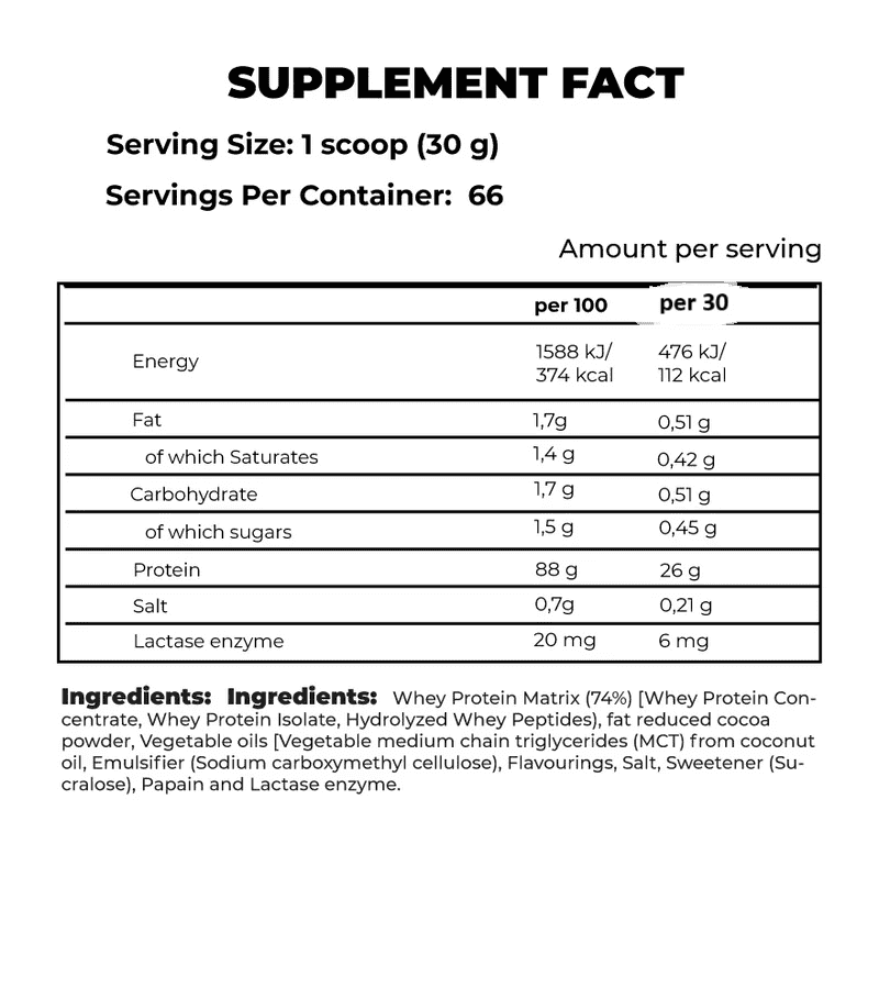 Whey Protein Matrix (74%) [Whey Protein Concentrate, Whey Protein Isolate, Hydrolyzed Whey Peptides], Fat-Reduced Cocoa Powder, Vegetable Oils (Medium Chain Triglycerides – MCT from Coconut Oil), Emulsifier (Sodium Carboxymethyl Cellulose), Flavorings, Salt, Sweetener (Sucralose), Papain and Lactase Enzyme.